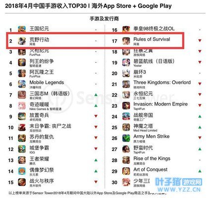 | 网易:稳中有升,大作品类覆盖最广 在2018年Q1财报中,网易提到游戏出海业务正在成为公司新的亮点,同时丁磊表示“会推出更多的游戏来适应我们的全球战略”。因此从公司战略层面来看,游戏出海业务将是网易接下来的一个重点,并且网易高层们对海外收入的持续增长也报以很大信心。 App Annie的厂商排名中网易第3,Sensor Tower的收入榜单上《荒野行动》第2、《终结者2》第17,都反映了网易的出海游戏一直保持在市场头部。而且在这些排名榜单以外,网易还有《阴阳师》、《决战!平安京》、《永远的七日之都》等新老游戏在亚洲市场表现不俗。
