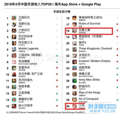熟悉这两款产品的朋友都知道,AOV是《王者荣耀》海外版,PUBGM是《绝地求生:刺激战场》,两者在国内早已有很高的人气。不过AOV在海外市场前期一直被《无尽对决(Mobile Legends)》压制,PUBGM则被《荒野行动》领先。2018年PUBGM登陆海外市场后,很快进入各国下载榜头部,AOV也在逐渐追赶与《无尽对决》的差距。 目前为止,PUBGM在海外市场的商业化才启动不久,还没有在出海游戏收入榜上亮相;AOV则持续上升到第13名,主要收入还是来源于亚洲市场。所以腾讯接下来的排名还有很大上升空间,一方面是PUBGM商业化后带来的收入,另一方面则是AOV亮相2018年雅加达亚运会势必起到更好的传播效应。而从另一个角度来看,腾讯虽然登上收入榜的出海游戏不多,但靠着AOV的稳定提升以及旗下众多产品的广撒网,杀入中国出海厂商收入前10之后还有后劲,不得不承认腾讯体量和实力的强大。 | SLG大厂们:仍占市场头部,但面临着新兴品类冲击 多年以来,中国出海厂商的收入基本都来自于SLG手游,在出海收入榜单上也行了一道独特的风景。 在游戏收入榜中,FunPlus的《阿瓦隆之王》、IGG的《王国纪元》、智明星通的《列王的纷争》、龙腾简合的《苏丹的复仇》、龙创悦动的《末日争霸:丧尸之战》等都是老面孔。这也折射出一个问题,目前出海的SLG手游正在面临同质化和市场接近饱。在众多SLG大厂里,只有《火枪纪元》、《三国志M》算是比较新的产品。除此之外,只有《刀塔传奇》开发商莉莉丝推出的新产品《剑与家园》在SLG手游中,有着较为突出的创新设计,也因此受到了海外市场的认可。 近两年以来,出海游戏品类开始像更丰富的方向发展。2017年以《阴阳师》、《少女前线》等为代表的二次元卡牌类,打开了日韩大市场,《无尽对决》和AOV为代表的MOBA类则席卷了整个东南亚。到了2018年,《荒野行动》、《终结者2》以及PUBGM等国产吃鸡手游,开始向全球更广泛的市场辐射——可以说对SLG这位老大哥的地位发起了不小冲击。 对此于,SLG大厂也开始考虑如何应对市场新的变化,比如智明星通就选择了代理《奇迹暖暖》丰富产品线,由此获得了巨大收益;而FunPlus则选择推出新的SLG精品巩固市场,同样也成绩不错。 | 低调的出海老厂:广种加精耕的战略部署 在出海厂商的排行榜中,还有像游族、奇酷工场、猎豹移动、乐元素等不少低调的老牌厂商。之所以称之为低调,是因为这些厂商在海外收入一直很高,却较少在国内提及。比如游族出海的时间已有5年,奇酷工场则是很少在日本市场以外有大动作,猎豹移动则是游戏比公司出名(比如《别踩白块儿》、《弓箭手大乱斗》等),至于乐元素在大家印象中被《开心消消乐》占了大部分。 实际上,像游族网络的海外收入多年来都在公司总营收占比很高,游族2017年报更是显示,海外业务的收入占比达到企业总营收的60.83%。游族在页游和手游领域,每年都会向海外市场推出多款产品,比如2017年的《狂暴之翼》在Sensor Tower出海游戏收入榜单中排名第5,此外《少年三国志》、《女神联盟》等经典产品也持续在海外发力。其中《少年三国志》在2018年4月又杀回出海游戏收入榜前30,而《狂暴之翼》也在欧美市场上有极高声誉,先后登顶53个国家及地区的游戏畅销榜。