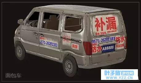 补漏车,极具《荒野行动》的特色载具,有补漏维修电话(官方客服电话),还有魔性喇叭;经小伙伴们测试,补漏车最大可载20人,真的可怕!最大时速为80km,由于外型设计,不适合跑山路,容易翻车,建议车技好的小伙伴可以随意行驶! 4、小轿车