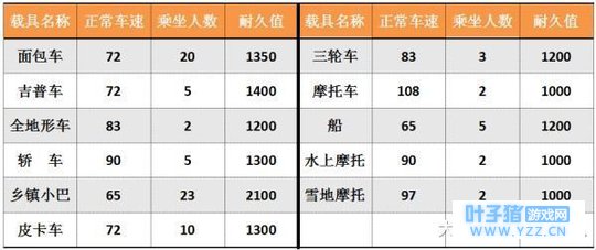 水陆两栖气垫船可乘坐5人,最大时速为85km;最大的优点就是可以在水面、陆地任意行驶;缺点就是:在陆地上由于底盘太低,非常容易卡在石头或者沟沟坎坎里面,要注意路况。 载具总结图