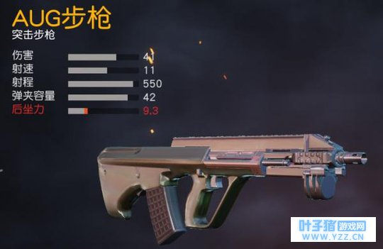 AUG突击步枪自带二倍光学瞄准镜,弹夹容量42发子弹,开镜后坐力超低,手感极佳!擅长连射的AUG步枪的强项在于近中距离的作战,在这个距离它的威力是不虚任何步枪的。特别是在后期决赛圈小范围作战,AUG的优势会发挥的淋漓尽致。 在枪械搭配上,AUG突击步枪完全能够掌控近中距离作战,可代替霰弹枪、冲锋枪和常规步枪,搭配狙击枪和81式、AK-47、M16A4最佳。再次遇到空投AUG步枪,小伙伴们不妨感受下这把枪的威力吧。