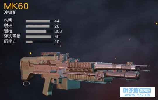 TOP 3 MK60冲锋枪MK60冲锋枪同样属于空投专属物资,还是逃脱不了被抛弃的命运,MK60使用9mm冲锋枪子弹,自身短射程,不可搭任何配件在很大程度上限制了其威力的发挥。