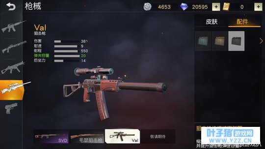 SVD狙击枪 作为《荒野行动》第一个可以连发的狙击枪,各方面数值也很不错,是小伙伴们前期较多使用的一把狙击枪,精英玩家们可能使用的较多,萌新和普通玩家里面使用的人数不是太多。不知道小伙伴们会怎么选择呢? 4、Val狙击枪