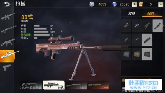 这把 Val狙击枪 是唯一一个自带四倍镜和消音器的狙击枪,更方面都很不错,就是威力太小了,与普通冲锋枪伤害值一般,因此很多萌新玩家使用的很少,但是在精英玩家的手里面,这就是一个“神狙”,比较自带四倍镜和消音器,很多精英小伙伴使用的较多。 5、88式狙击枪