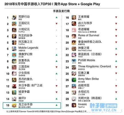 6月12日,数据分析公司SensorTower发布了2018年5月中国游戏出海报告,报告揭示了2018年5月中国手游在海外的收入TOP30和下载量TOP30。 网易吃鸡巨作《荒野行动》国际版自去年11月变现以来,首次登上出海收入榜首,5月收入几乎全部来自日本玩家;《PUBG Mobile》首次进入中国手游海外收入TOP30;此外收入榜上也出现了两款新作,分别是《龙之谷手游》和《光明大陆》韩国版;近期的爆款黑马Super Tapx旗下休闲小游戏《Love Balls》拿下5月出海下载量第一…… 以下是手游那点事带来的相关解读: 一、《荒野行动》登顶5月手游海外收入榜,日本市场占比高达99% 《荒野行动》可以说是打破了SLG垄断出海收入榜前列的规律。 根据SensorTower统计,1月份还排在收入榜第24名的《荒野行动》,2月份已经飙升至第5名,3月份和4月份蝉联TOP2的位置,超越《火枪纪元》、《列王的纷争》、《丧尸之战》等出海大鳄。而在5月份,《荒野行动》更是挤下了收入霸主《王国纪元》,登顶5月中国手游出海收入榜,在下载榜排在第16名。