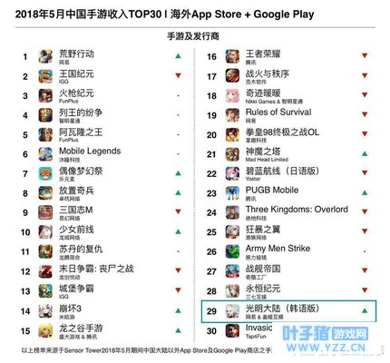 《PUBG Mobile》5月韩国App Store游戏免费榜和畅销榜排名 三、《光明大陆》韩语版上线一个月收入排名进入TOP30,吸金能力强劲 除了“吃鸡”在海外市场的高歌猛进,5月的中国手游海外收入榜单中也出现了新面孔,由网易自研、盖娅互娱在韩国市场发行的西方魔幻MMORPG手游《光明大陆》(이터널 라이트)进入海外收入TOP30,排在第29名。