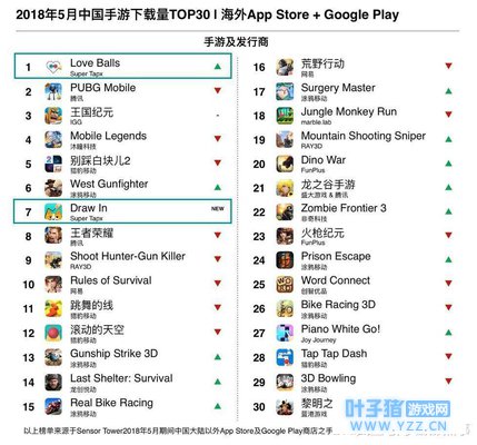 在5月的中国手游出海下载榜上,休闲游戏厂商行列又出现了一匹“黑马”:Super Tapx旗下两款休闲小游戏进入下载榜TOP10,其中《Love Balls》挤下《PUBG Mobile》拿下TOP1,新游《Draw In》排在下载榜第7的位置。
