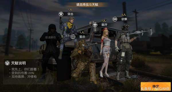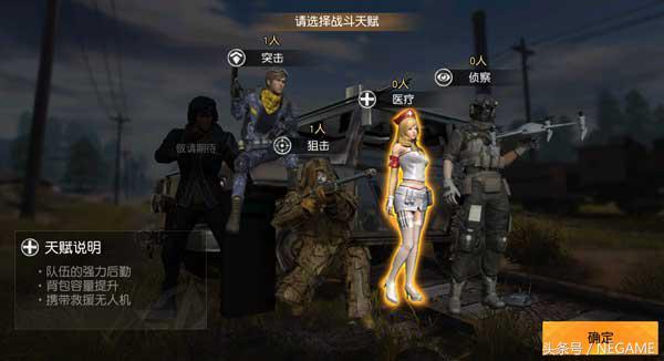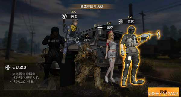 点击进入游戏后,在准备阶段可选择 多种战斗天赋,获得特色能力加成: 目前开放了四种战斗天赋, 侦查. 医疗. 突击. 狙击 ,给玩家带来特色属性以及道具加成;具体如下: 1. 侦查战斗天赋 天赋说明: 大范围信息收集 携带强化版无人机 携带UZI冲锋枪