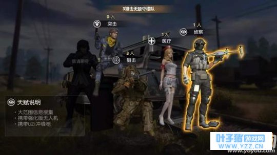 侦察兵作为一个团队核心,情报信息上的天赋能力极为突出,但是不同的侦察兵给团队带来的感受是不同的。如果一个匹配队伍中的侦察兵没有好的信息分享能力,报点并且指挥延误,那么将使队伍战力不升反降。 所以在路人队伍中,天命妹推荐大家不要选侦察兵,通过火力上的强势来强化作战能力。而医疗兵增加了队伍的生存能力,也可以作为物资储备的移动仓库。 3狙击守家阵容 3狙击手,1医疗1侦察阵容,适合占山为王的有信息交流能力的队伍,适合对一个视野宽阔区域的防守。