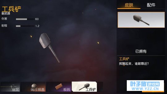 工兵铲,伤害60比高压锅盖还略逊一筹,不过稍微加了一点点的射程达到了1.2,也可以挡子弹,属于比较中和的属性。