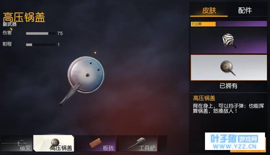 鱼叉由于区域限制太大,这里就跳过不讲了。 高压锅盖,伤害75,射程1,其最大的特点就是可以护住玩家的菊花不受伤害,更倾向于防御,攻击的话也非常不错。