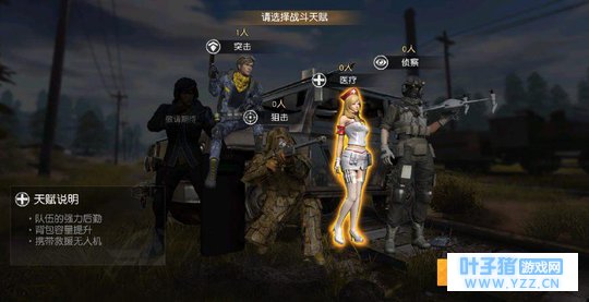 职业 职业目前只有4个,在游戏里面称为 战斗天赋 ,每一个天赋携带的武器装备也是不一样的,各种武器伤害加成也是不同的,所以根据需要去选择吧。 突击 :携带武器是:MP5和手雷,冲锋枪伤害+30%、手雷伤害范围+30%,近战强力加成。 狙击 :携带武器是:毛瑟狙击步枪和4倍镜,狙击枪伤害+20%,属于远程狙击。 侦察 :携带武器是:UZI冲锋枪、强化版无人机,属于侦查情报的。 医疗 :携带武器是:救援无人机,背包的容量大大提高,属于队伍的后勤人员。