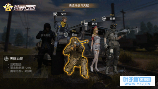 【详解四种战斗天赋 分清优势找准定位】 四种可选战斗天赋中,狙击天赋擅长远程射击,在使用狙击枪时伤害输出将提升20%。狙击天赋的玩家,落地即装备毛瑟狙击枪和四倍镜,是全队中的最高火力点!