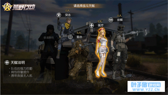 《荒野行动》上线以来,一直致力于为玩家提供别具新意的游戏玩法,带来更丰富有趣的游戏体验。在接下来的更新中,《荒野行动》即将推出“协同作战”新玩法,为玩家带来与众不同的团队作战体验。 【协同作战玩法上线在即 分工合作考验默契】 “协同作战”玩法下,玩家将以五人中队为单位,通过选择不同的天赋,组合搭配成最强的战队阵容。玩家在每局游戏开始后可以选择突击、狙击、医疗和侦察这四种天赋中的任意一种。每一种天赋都有其专属的能力加成,只有根据队内每一位成员的优势来合理选择搭配才能获得最强战斗力!