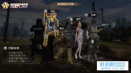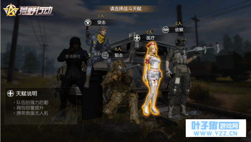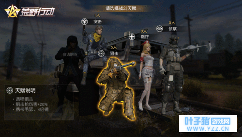 《荒野行动》自上线以来推出了多种别出心裁的休闲玩法,让玩家的竞技体验更有乐趣!在即将到来的更新中,《荒野行动》新玩法“协同作战”将与荒野精英们见面。新玩法将会为玩家提供各具特色的天赋选择,带来更丰富有趣的组队战斗体验。赶快约上小伙伴们一起,来打造属于你们的完美阵容吧! [四大天赋详解 打造荒野梦之队] 玩家可以在“协同作战”中选择狙击、突击、侦察、医疗四种战斗天赋,每种天赋各具特点,携带不同的初始装备,并具有不同的能力加成。