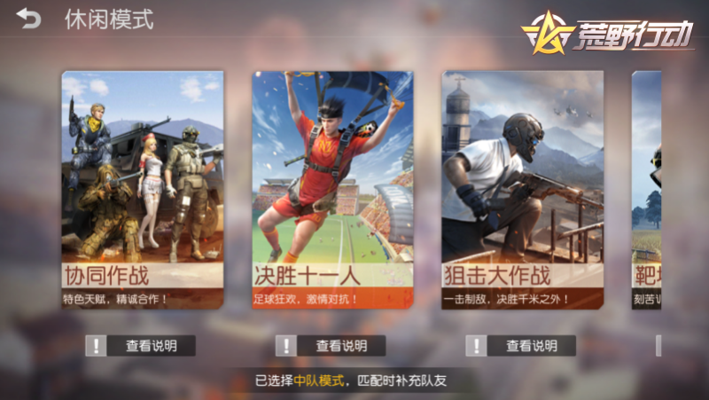 《荒野行动》全新模式“决胜十一人” 【协同作战乐趣无穷各取所长精诚合作】 全新休闲玩法协同作战已经全面上线,为玩家带来了分工合作的默契大考验!在协同作战玩法将在五人中队模式下进行,玩家可在狙击、突击、侦察、医疗四种战斗天赋中任选一种。每种天赋都有其专属定位,并具备不同的初始装备和能力加成。