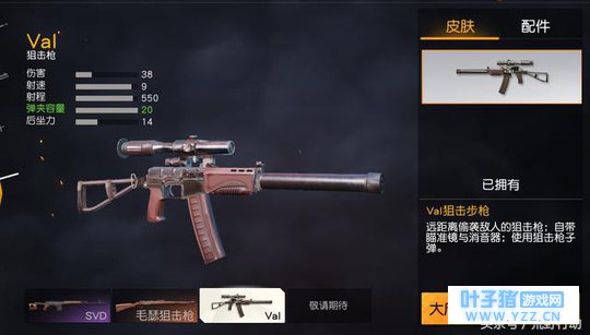 APS这把水陆步枪,虽说伤害是步枪中最高的55,但是其开火模式只有单点一种。APS水陆步枪的弹夹容量只有15,相比其他步枪来说确实很少。即便如此,喜欢APS水陆步枪的玩家还是有很多,不为别的,只为它的高伤害,两枪一个!运气好的话,你会遇见一些装备不精良的敌人,你甚至可以一枪带走他!那种瞬间掌控全局的感觉确实美妙! TOP 3 Val狙击枪