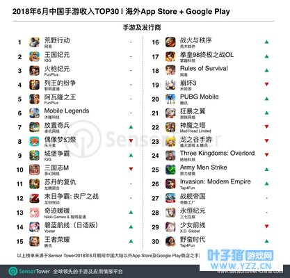 根据对Sensor Tower商店情报平台最新数据的分析,这篇报告中揭露了2018年6月期间,哪些国产手游作品在中国大陆以外的海外App Store及Google Play商店中,出海吸金量及下载量名列前茅。我们的数据及分析揭示,网易吃鸡巨作《荒野行动》国际版自去年11月变现以来,连续第二次占领出海收入榜首,6月期间吸金几乎全部来自日本玩家。而下载榜上,Super Tapx旗下休闲小游戏《Love Balls》继续红热大洋彼岸,排名再次超过《PUBG Mobile》,继续拿下6月出海下载量第一。 收入排名TOP30:《荒野行动》再次夺冠,前六强作品均保持5月排名强势