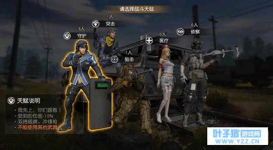 守护不能使用其他主武器,只能使用UZI冲锋枪,但是UZI冲锋枪无法装配任何配件,这也注定了守护只适合中近距离作战,太远了根本打不到对方。不过可以多收集些子弹和手雷、烟雾弹这类的,对阵的时候,在队友的掩护下逼近对手,只要到达自己射程内就对其火力覆盖,打得对手头都不敢露。不过,要是对方也是守护的话,两盾牌怼在一起就尴尬了。