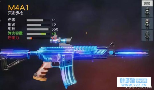 P90和UZI拥有荒野行动中最低的后坐力,射击精度毋庸置疑,但是P90的弹夹容量高达50,是UZI的两倍,而且UZI连瞄准镜都不能装,所以UZI不太适用于黑夜。而P90安装微光夜视仪之后,瞬间化身黑夜神器,根本不虚任何对手! M4A1