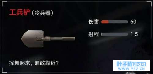 工兵铲作为野外生存的必备武器,在荒野行动中一直处于不温不火的状态下,因为其各种属性在冷兵器中都是比较中庸的,也正是因为这样的设定,它制造伤害的能力会比以上两种武器更加出色,工兵铲较长的射程优势很好的弥补其伤害的不足的短板