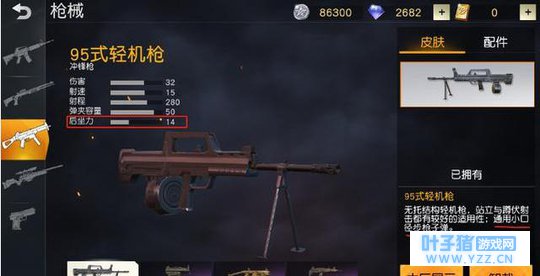 这就是我们今天的冷门主角:95式轻机枪,从面板数据来看,这一把隶属于冲锋枪系列的95机枪,在伤害方面就占据了劣势,射速占优,射程方面的数据还可以接受,弹夹容量方面有着一定的优势,然而,这个后坐力简直就是惨不忍睹,14后坐力的冲锋枪?这个后坐力简直可以和连狙有的一拼了。