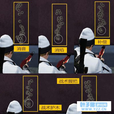 所有的枪械能够降低后坐力,就能够更加容易的进行压枪。游戏中能够降低枪械后坐力的配件包括:枪口补偿器、枪口消焰器、战术护木、战术握把以及枪托。枪口的消声器只具备消除火光和降低枪声的作用,不会降低枪械后坐力。战术护木在垂直方向上表现较好于握把,但战术握把可以降低水平方向上的后坐力,更加适用于扫车等移动压枪。(见下图弹道对比图)