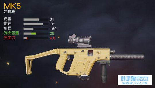 MK5冲锋枪 冲锋枪虽然也是一种近战枪械,但是05式、MP5等冲锋枪有着其独特的作战优势,在中后期的攻楼以及决赛圈的作用发挥都是不错的。MK5冲锋枪的射速和后坐力属性都很强,但致命缺陷在于弹容量这一条属性,25发的子弹,也只有一次射击的机会,容错率是非常小的。
