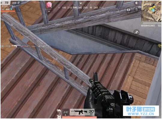 红楼楼梯进入阳台的位置靠右侧的墙角,这是一个非常隐蔽的卡位点,对手在上楼梯的时候一般很少会观察到这里,我们在这里可以切换第一视角,这样敌人上来的第一时间我们就能开枪射击。