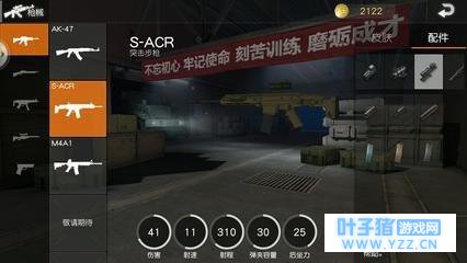 4、S-ACR 它的整体枪支感觉枪支长,枪口短一点,它可能没有AK-47和M4A1,但他是无形中的杀手,极低的后坐力和他可以比其他两只枪多装配些配件,表示了全配的他可以非常强。 S-ACR和M4A1使用的是同样的子弹,威力也相同,但和M4A1不同的就是他在数值上牺牲了一点速度和射程,就获得了,极低的后坐力,而且游戏中有着不少减后坐力的配件,添加在一块,一把满配的S-ACR可以让你子弹能稳定的恐怖。 这把枪优秀的后座力,可以使他在远距离快速射击而不产生特别大的一个后坐力的反应。远距离配合四倍镜非常不错的,远距离的优势比较大,射速快稳定率高。 装备红点可以近距离进行扫射,装备高倍镜可以打远点敌人,进行快速的点射。比较适合在没有狙击枪的装备一件这把枪,在远距离的效果比较优势。