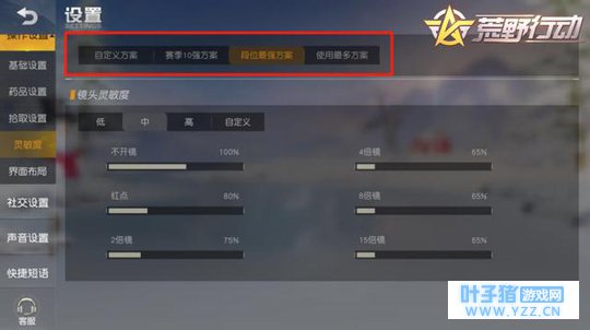 而在操作设置里,则新增了灵敏度的大神方案。除了自定义方案之外,还有赛季10强方案、段位最强方案、使用最多方案可供参考与选择,各位荒野精英可以逐一尝试,选择最适合自己的灵敏度方案哦!