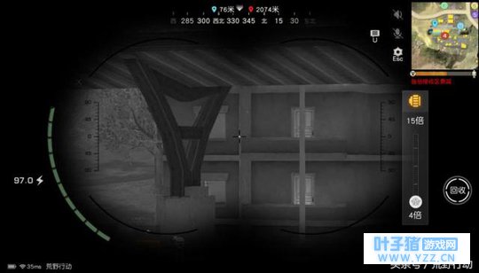 但由于环境变得宽阔 所以显得范围不大 只能清楚照亮脚下的一圈 红外望远镜 这个模式中特有的望远镜 可在 4~15倍 之间调节 一般情况下 我们用4倍就足以应战啦