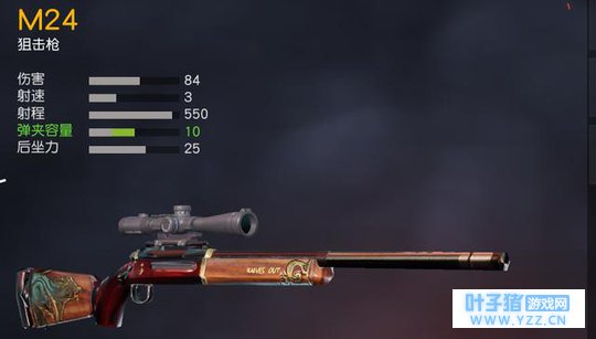 M24的狙击枪,这把枪在绝地求生中有着相当上佳的表现,尤其是配备消音之后,很多大神玩家都喜欢使用,而在荒野中,这把武器却少有人问津,虽然伤害要比98K多出12点,但是在伤害判定上并不强于98K,也不会因为多出的12点伤害,而在射程内打爆三级头盔。