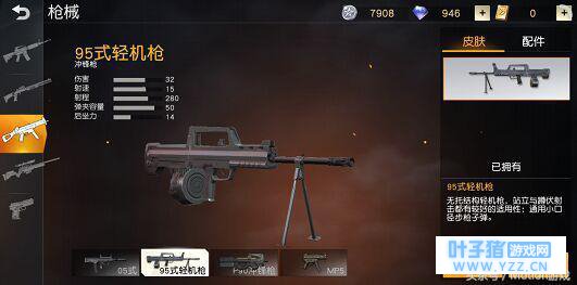 95式轻机枪:中距离威力最大 冲锋枪是中距离作战武器,在决赛圈中,一把冲锋枪是十分好用的。在所有的冲锋枪中,我觉得95式轻机枪是威力最大的,首先它的伤害是四种冲锋枪中伤害最大的一把,并且弹夹容量也很大。弹夹容量高就减少了换弹的时间,从而可以打出可持续性的高伤害。不断的攻击不仅可以直接压制敌人,还能够在乱战中将敌人击杀。因此95式轻机枪是中距离威力最大的冲锋枪。