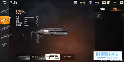 M88C:近战威力最大 霰弹枪是落地后最容易捡到的枪,而现有的三把霰弹枪中M88C是伤害最高的一把,并且攻击距离也相对较远,近距离作战中几枪就可以击倒敌人。除此之外,M88C可以安装红点瞄准镜,这也就解决了霰弹枪命中率较低的问题。落地之后如果没有合适的其他类型的枪支选择,M88C也是不错的。
