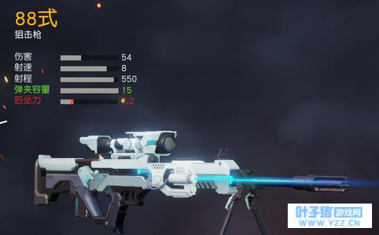 国产狙击武器88式连狙,这把武器是伤害只有54点,虽然能连发射击,但是枪口跳动太过明显,趴下射击由于支架的作用射击效果稍好一些,然并没啥大用,武器更改之后,射程提高,只是伤害限制了这把武器的能力。