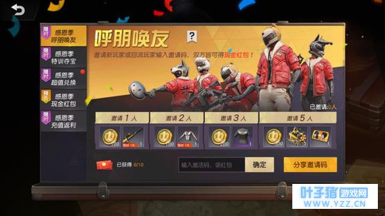 本次周年庆典的福利大放送活动自更新后持续至11月21日,活动期间《荒野行动》将送出八大福利回馈广大玩家。11月2日-3日,9日-10日,每晚18点-21点开启现金红包玩法。玩家进入参与经典模式就有机会拾取现金红包,5元提现,最高奖励¥4999元。召回战友或邀请新玩家输入邀请码,双方皆可获得现金红包。