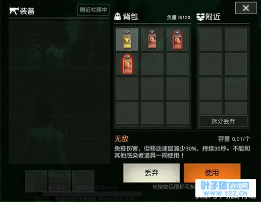 无敌药水估计不用补漏君解释了吧?感染者喝下之后即可进入无敌状态,免疫所有形式的伤害。不过无敌药水有个小小的弱点,在喝下之后,荒友们的移动速度也会降低30%。也正是因为这个弱点,无敌药水不适用于宽敞区域的作战。 不过荒友要是在攻楼时,喝上一瓶无敌药水,那效果,杠杠的!