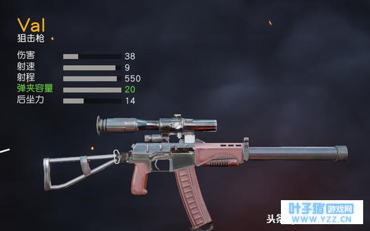 虽然MK5由于15发的低弹容量,在游戏中的出场率并不太高。但是玩家们忽略了它强大的属性成长潜力。做为可以装备四种配件的它,满配后的均衡属性甚至强于很多主流步枪!而它最被诟病的弹容量是可以通过扩容弹夹增加到25发的,这样也提高了它的续航能力。 第三:VAL狙击枪