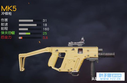 UZI做为在荒野行动游戏中都最常见的冲锋枪,它有着庞大的粉丝群体。超快的射速弥补了伤害不足的缺点,可以在瞬间就把一梭子子弹全部倾泄出去!但是做为冲锋枪它的射程略短,所以通常玩家们都是在跳伞落地或者巷战时选择它。不过在装备了扩容弹夹后,35发的弹容量足够秒掉1-2个敌人。而且做为荒野行动中后座力最低的枪械,它也是最适合新手使用的武器之一了! 第二:MK5冲锋枪