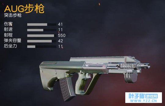 AUG是空投枪,捡到的几率较小。满配的情况下,它拥有强大的火力。弹夹容量也是其优势所在,但射速以及后坐力对比其他两把枪稍显逊色,所以推荐压枪技术好的老司机胖友们使用。