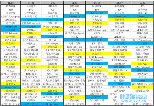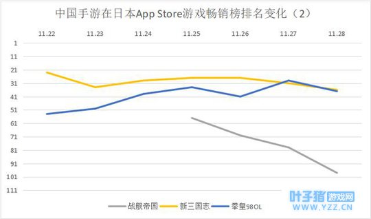中国手游入围日本 App Store 游戏畅销榜 Top 100 排名情况,“-”代表未进入 Top 100 。注:本表中的本周指11月22日至11月28日,下同。 此外,本周共有8款新游入围日本 App Store 游戏畅销榜 Top 30,相比上周下降3款,其日入榜数量则在 3 款至5 款之间。