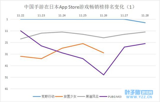 App Store游戏畅销榜海外手游入围变化 中国产品在本周共有7款进入日本 App Store 游戏畅销榜 Top 30,相比上周减少3款,其日入榜数量则在 3 款至 5 款之间,相比上周也有一定程度的下滑。 值得注意的是,《荒野行动》在本周连续六天保持日本 App Store 游戏畅销榜的首位。这款游戏在连续保持畅销榜前五的状态下,于11 月 22 日面向日本市场推出了与《进击的巨人》第二次联动活动,凭借这一IP在日本所拥有的高用户量,连续保持在畅销榜榜首。