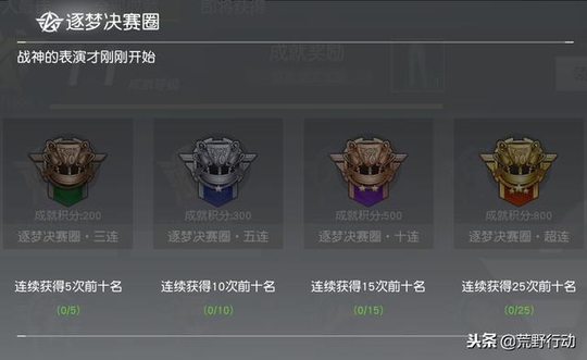 第二个成就需要玩家稳!它可以说是低配版的“连胜”成就,因为它要求我们连续进入前10名5、10、15、25次,虽然只需进入前10就行,但是最高等级的成就需要连续25次,难度还是非常大的。 抬一手,抬一手