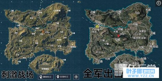 《绝地求生:全军出击》 上面虽然有提到两者都还原了PC版的地图原型,但“刺激战场”的地图看起来要更大,标示地点更多,像“靶场”“观测站”“农场”等地标就是“全军出击”里没有的。当然部分地点两者因为翻译不同所以显示也不同,比如S山=山顶废墟之类的。