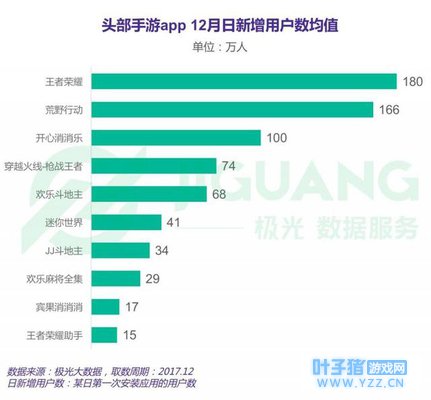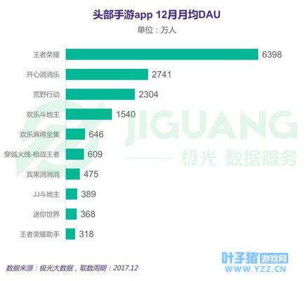 有同学可能会说了,王者荣耀安装量只有1.69亿但玩的人不一定多啊。所以老王这也po一下,12月的手游日活跃用户数据。都知道12月份,是中小学生的期末,用户日活跃肯定要比平时,但即便是这样王者荣耀依然遥遥领先。同比2016年12月,依然要多了1000万的活跃玩家,跟自己比还是进步了。