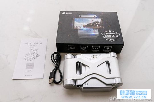 这款吃鸡王座X1的包装设计和游戏手柄的设计基本类似,都是黑色色调为主,不过打开包装后看到这个吃鸡王座是银色的外观设计。一个吃鸡王座,一根USB连接线,一张说明书,这就是整个包装里的所有内容。
