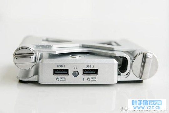 机身的侧翼有2个USB接口,2个接口都可以连接键盘和鼠标,稍有不同的地方是,USB 2的接口还多了一个充电功能,可以给安卓手机充当移动电源使用(苹果手机和平板无法充电),两个USB接口中间有一个圆形蓝色指示灯,当打开机身未和手机蓝牙配对上时持续闪烁蓝灯,配对成功后蓝灯停止闪烁,蓝灯将保持明亮。