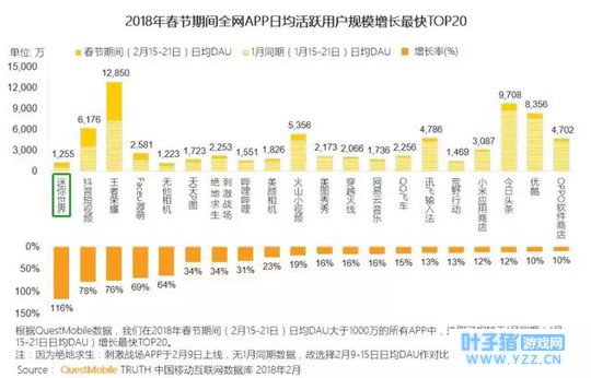 看看春节你玩的游戏和大家一样吗? 春节刚过,就已经有很多人关心《王者荣耀》怎么样了?“吃鸡”手游谁赢了?今年春节又有哪些黑马游戏跑出来了?各类型游戏谁表现得最好?手游那点事结合今天QuestMobile发布了《2018年春节娱乐洞察报告》,用数据告诉你手游产品在春节大战的最新战况。 一、《王者荣耀》又复燃了!春节DAU近1.3亿,较平时增长76%“有团,就有聚”。《王者荣耀》除了春节广告走心,其成绩也相当亮眼,特别是这种亲朋好友聚首一堂的场景,可以说得上是《王者荣誉》的主场。因此其以76%的春节DAU增长率挤进“2018春节DAU增长最快App”Top3,其中DAU超过1.28亿,是游戏类App之最。