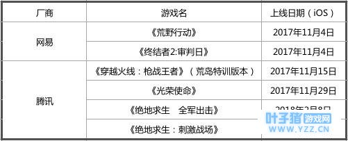 春节前,腾讯两款吃鸡手游《绝地求生 全军出击》和《绝地求生:刺激战场》迅速赶在同一天上线。加上此前《CF手游》、《光荣使命》,以及网易两款《荒野行动》、《终结者2:审判日》,短短3个月左右的时间里,腾讯网易两大厂总共6款手游均悉数登场。